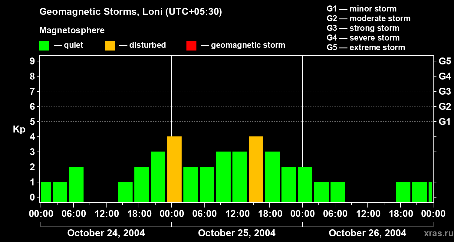 Changes in the geomagnetic index Kp from October 24 to 26, 2004 for mid latitudes