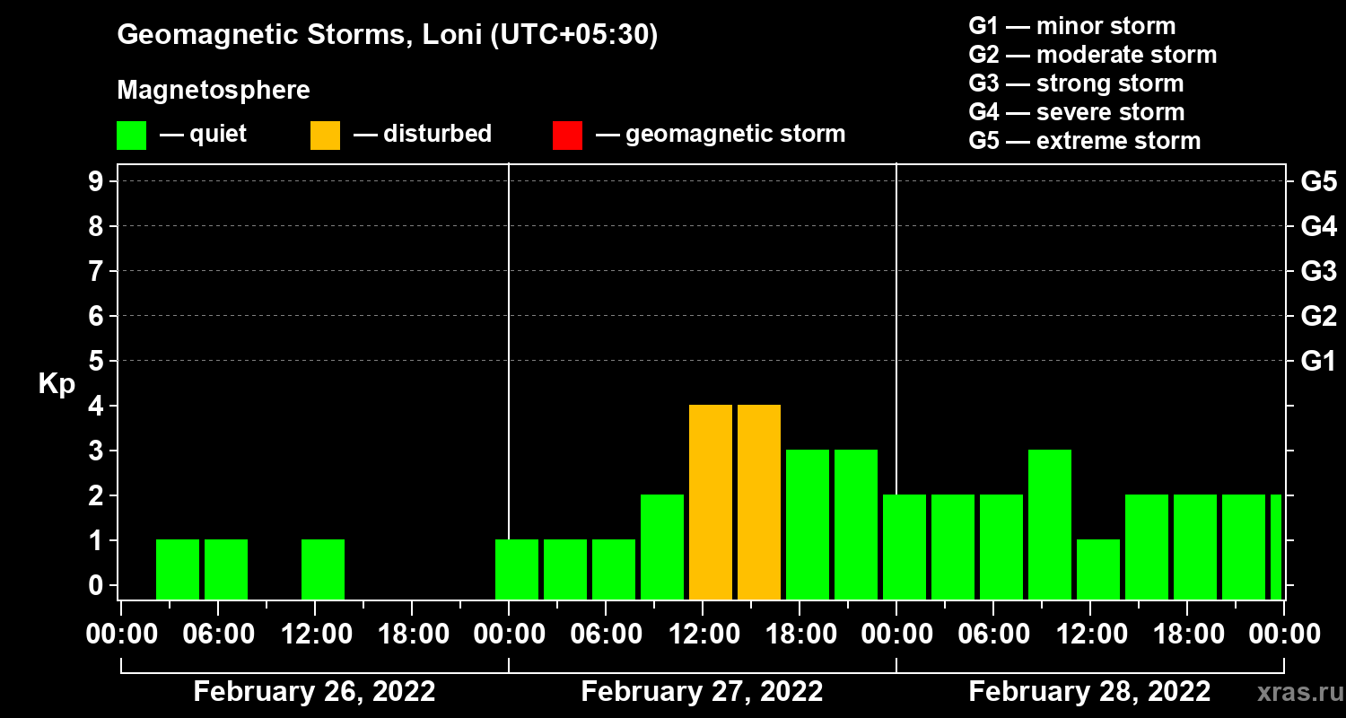 Changes in the geomagnetic index Kp from February 26 to 28, 2022 for mid latitudes