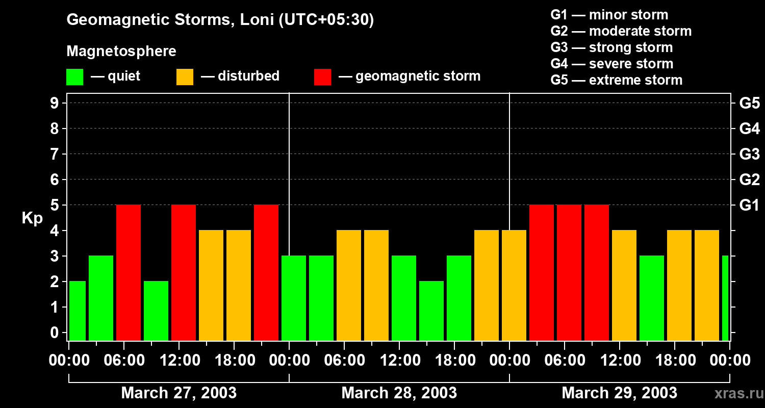 Changes in the geomagnetic index Kp from March 27 to 29, 2003 for mid latitudes