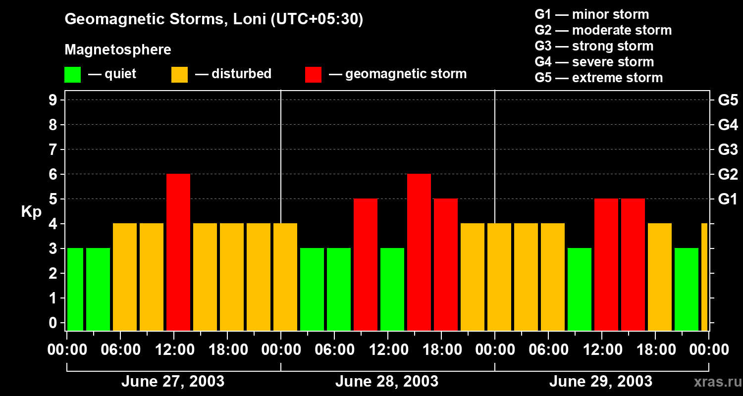 Changes in the geomagnetic index Kp from June 27 to 29, 2003 for mid latitudes