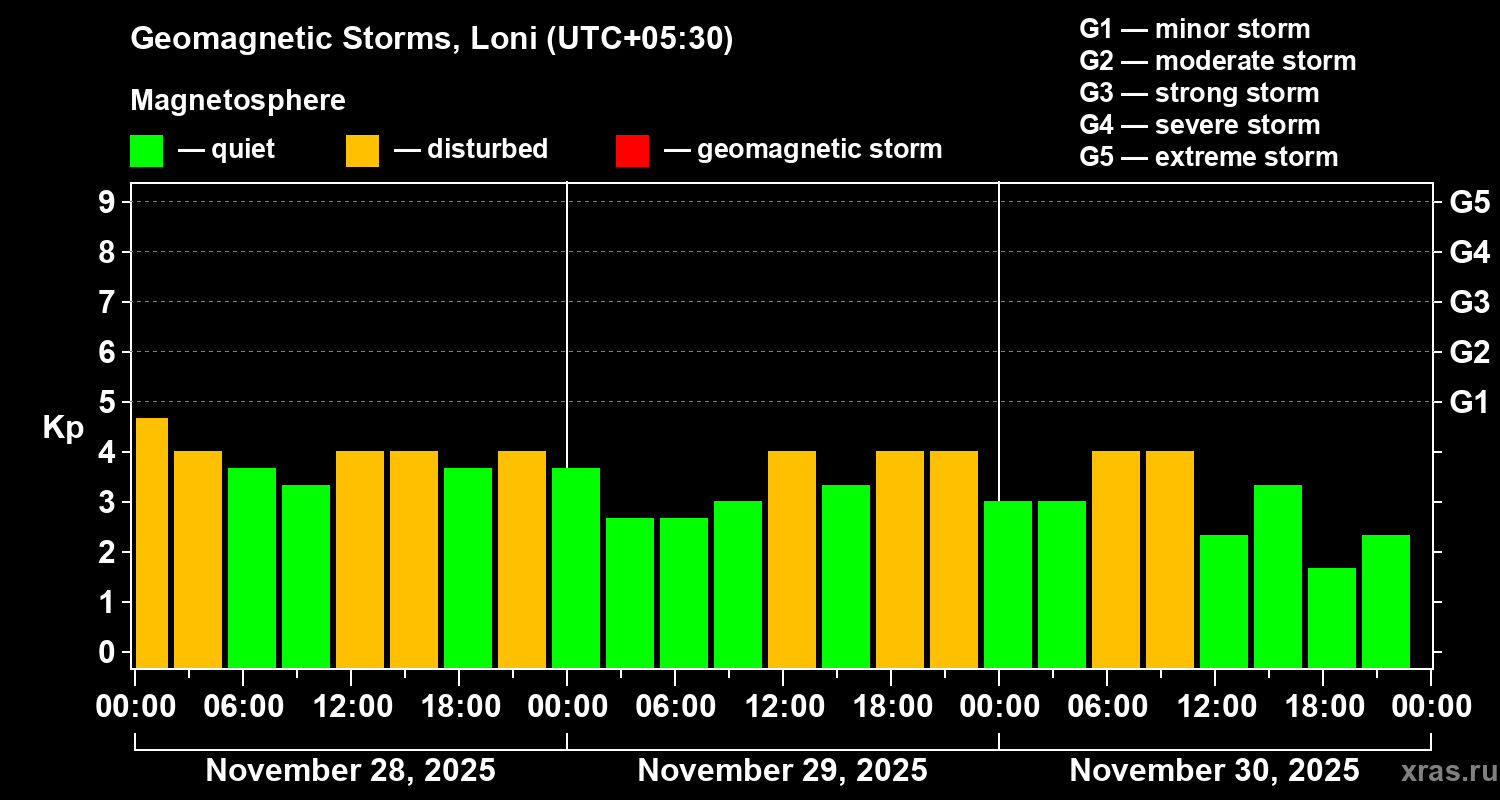 Changes in the geomagnetic index Kp from November 28 to 30, 2025 for mid latitudes