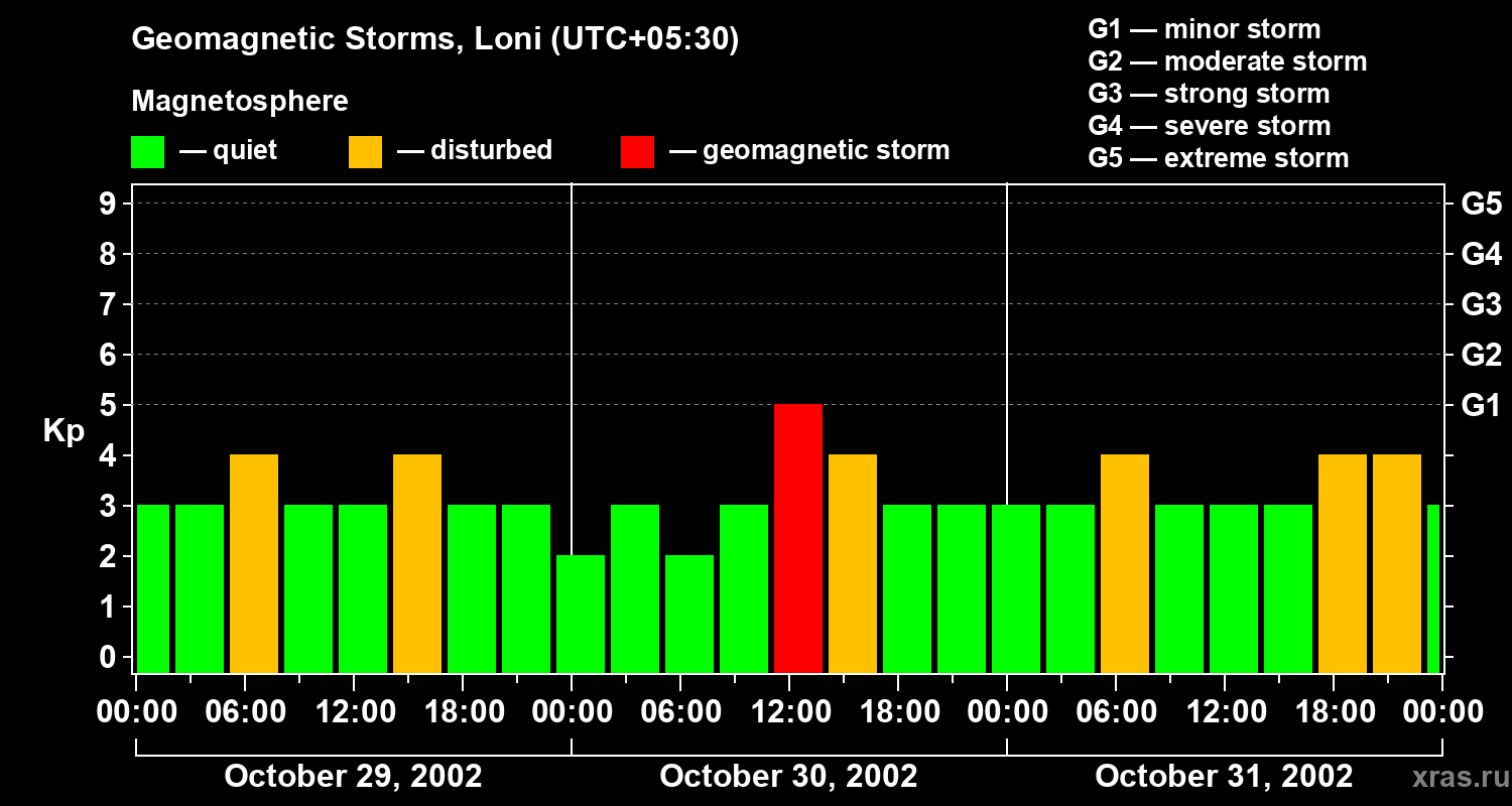 Changes in the geomagnetic index Kp from October 29 to 31, 2002 for mid latitudes