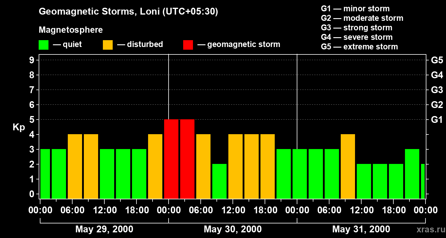 Changes in the geomagnetic index Kp from May 29 to 31, 2000 for mid latitudes