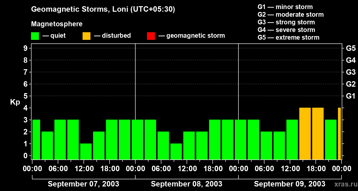 Changes in the geomagnetic index Kp from September 7 to 9, 2003 for mid latitudes