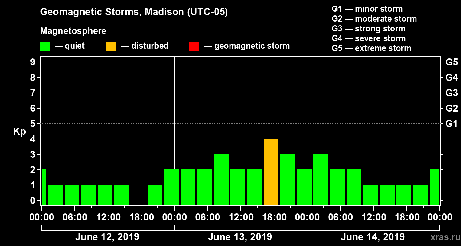 Changes in the geomagnetic index Kp from June 12 to 14, 2019 for mid latitudes