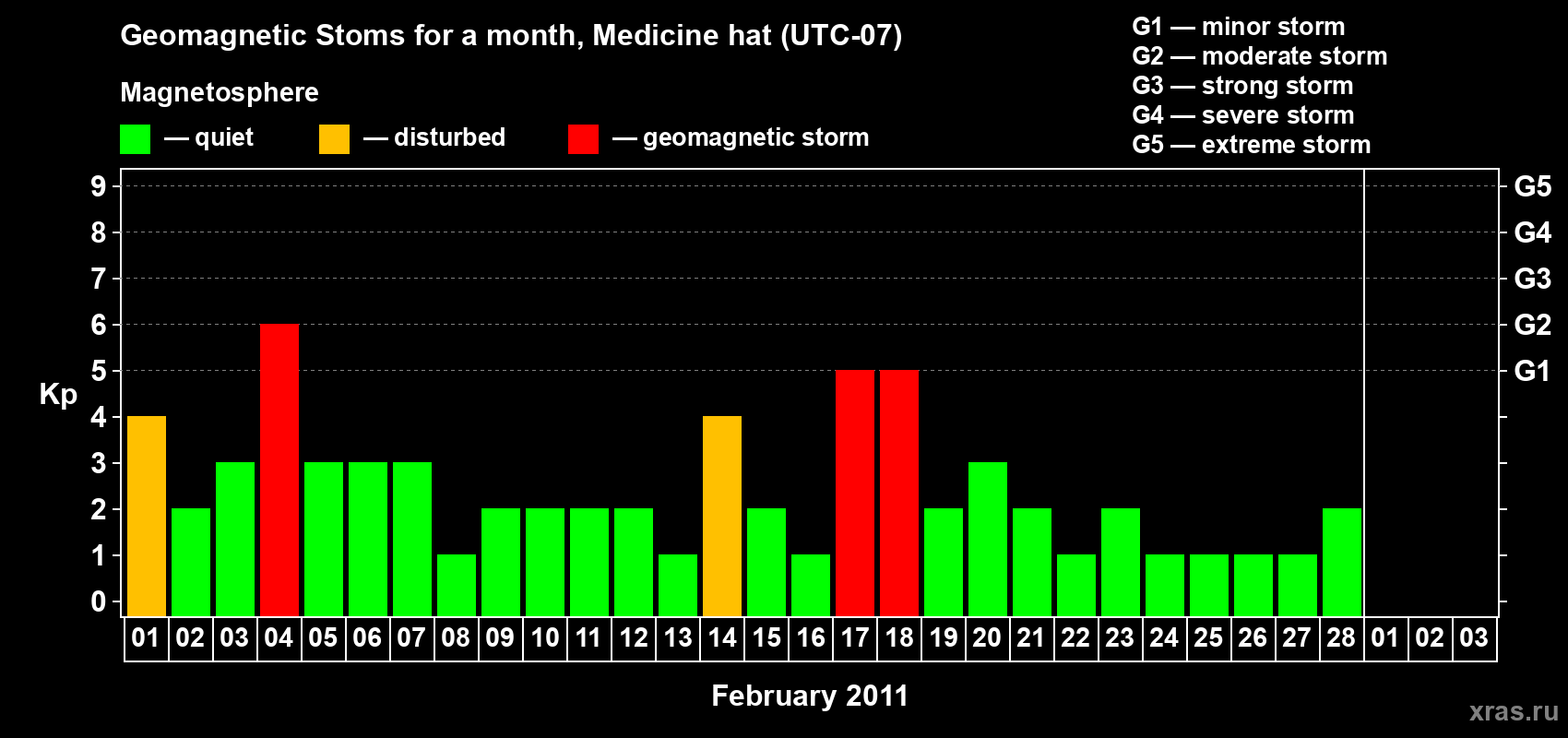 Geomagnetic storms in Medicine hat in February 2011
