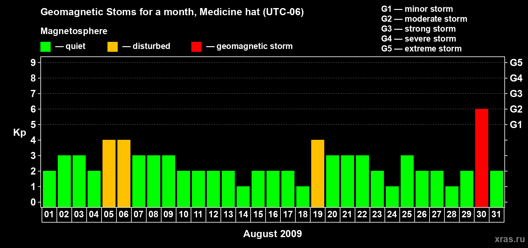 Geomagnetic storms in Medicine hat in August 2009