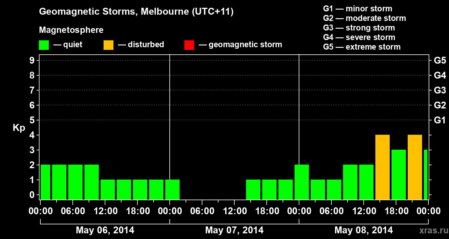 Changes in the geomagnetic index Kp from May 6 to 8, 2014 for mid latitudes