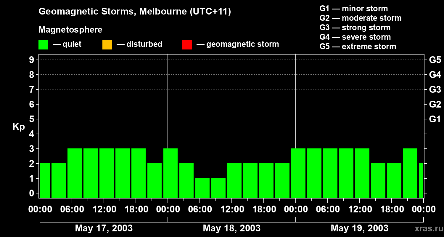 Changes in the geomagnetic index Kp from May 17 to 19, 2003 for mid latitudes