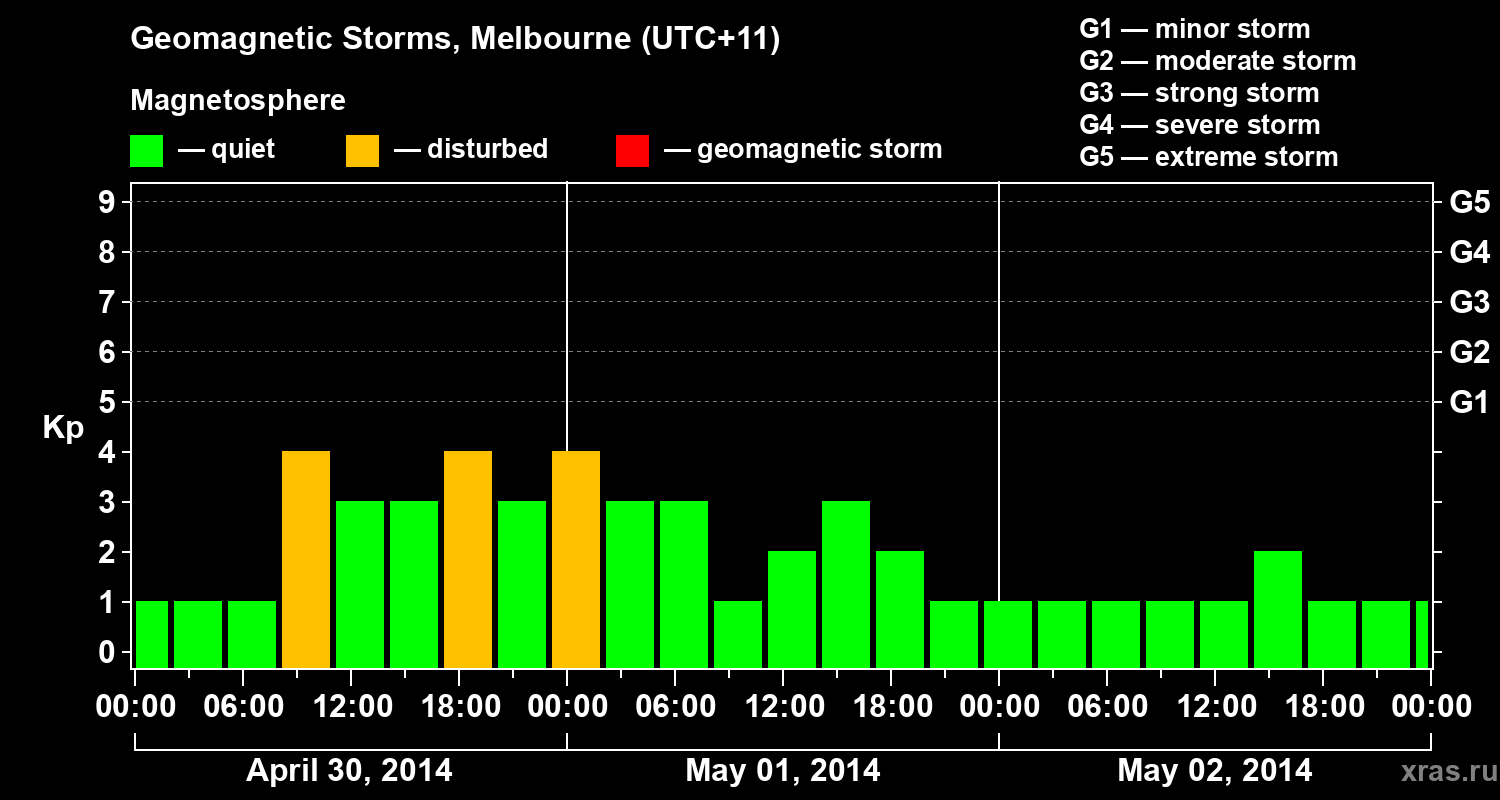 Changes in the geomagnetic index Kp from April 30 to May 2, 2014 for mid latitudes