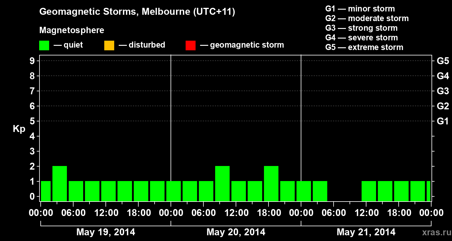 Changes in the geomagnetic index Kp from May 19 to 21, 2014 for mid latitudes
