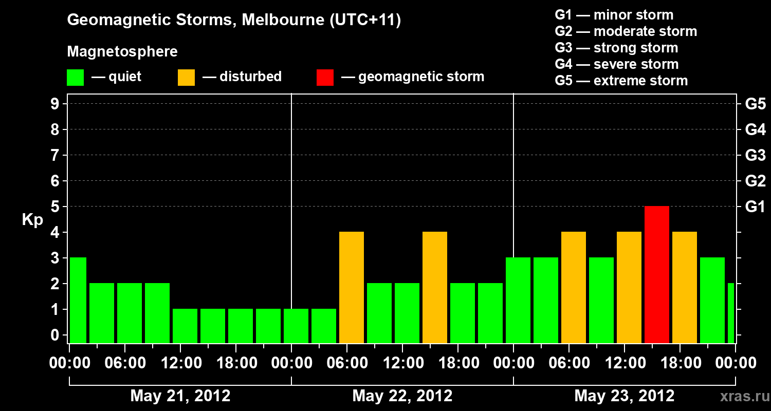 Changes in the geomagnetic index Kp from May 21 to 23, 2012 for mid latitudes