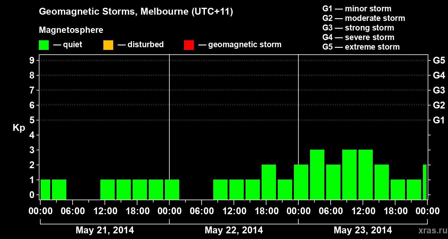 Changes in the geomagnetic index Kp from May 21 to 23, 2014 for mid latitudes