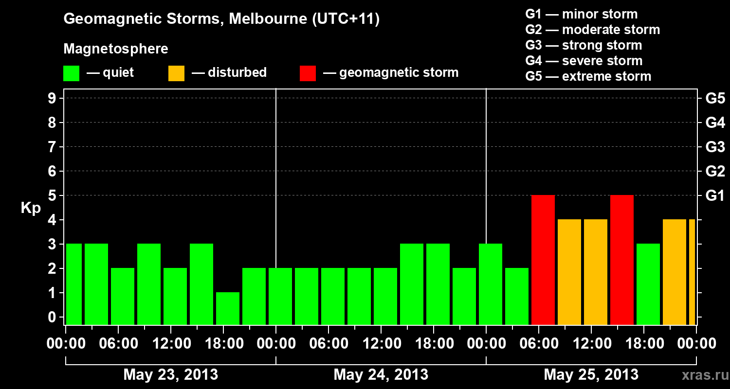 Changes in the geomagnetic index Kp from May 23 to 25, 2013 for mid latitudes
