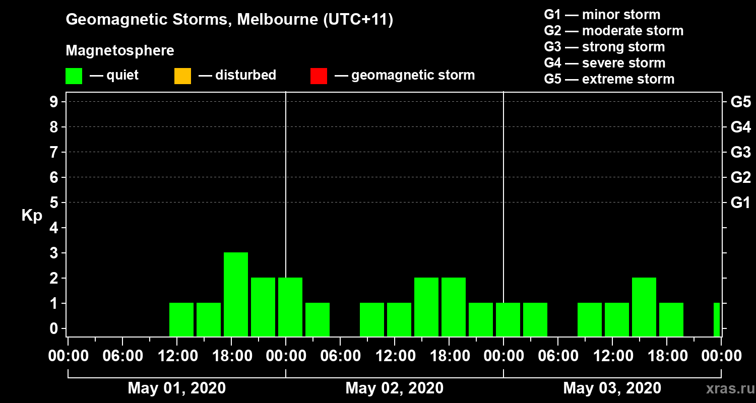 Changes in the geomagnetic index Kp from May 1 to 3, 2020 for mid latitudes