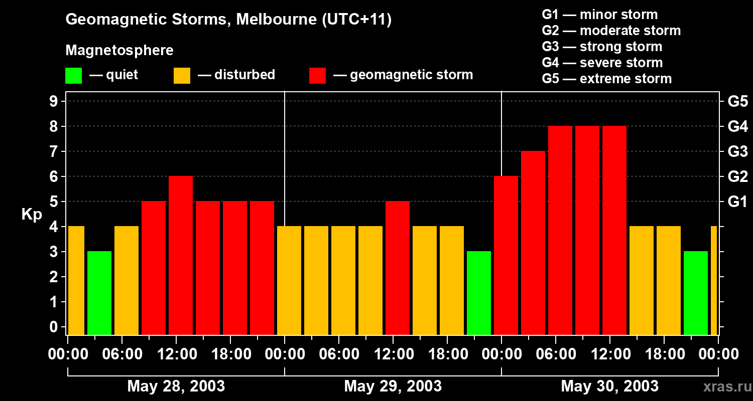 Changes in the geomagnetic index Kp from May 28 to 30, 2003 for mid latitudes