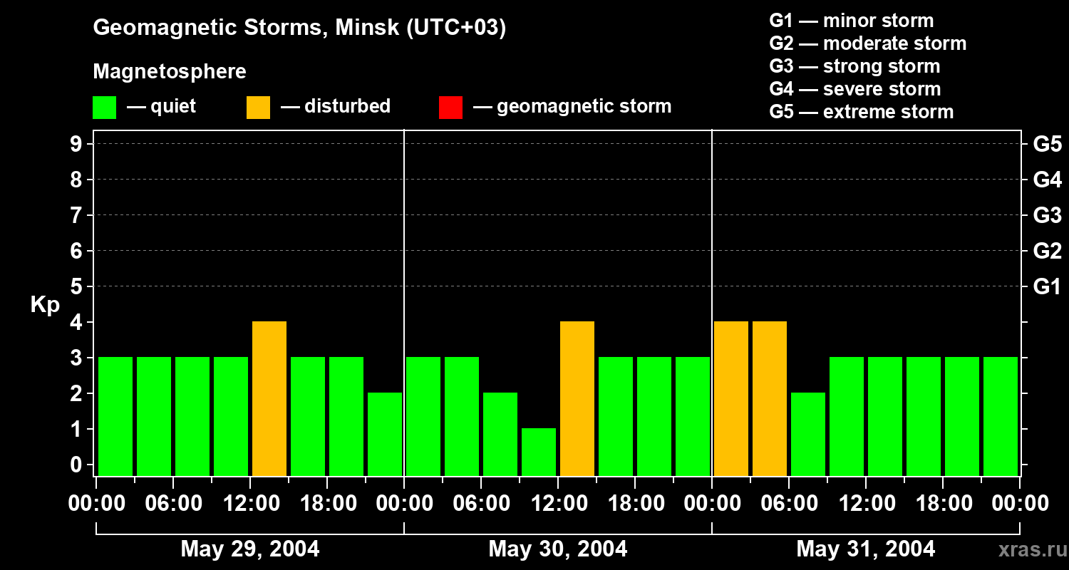Changes in the geomagnetic index Kp from May 29 to 31, 2004 for mid latitudes