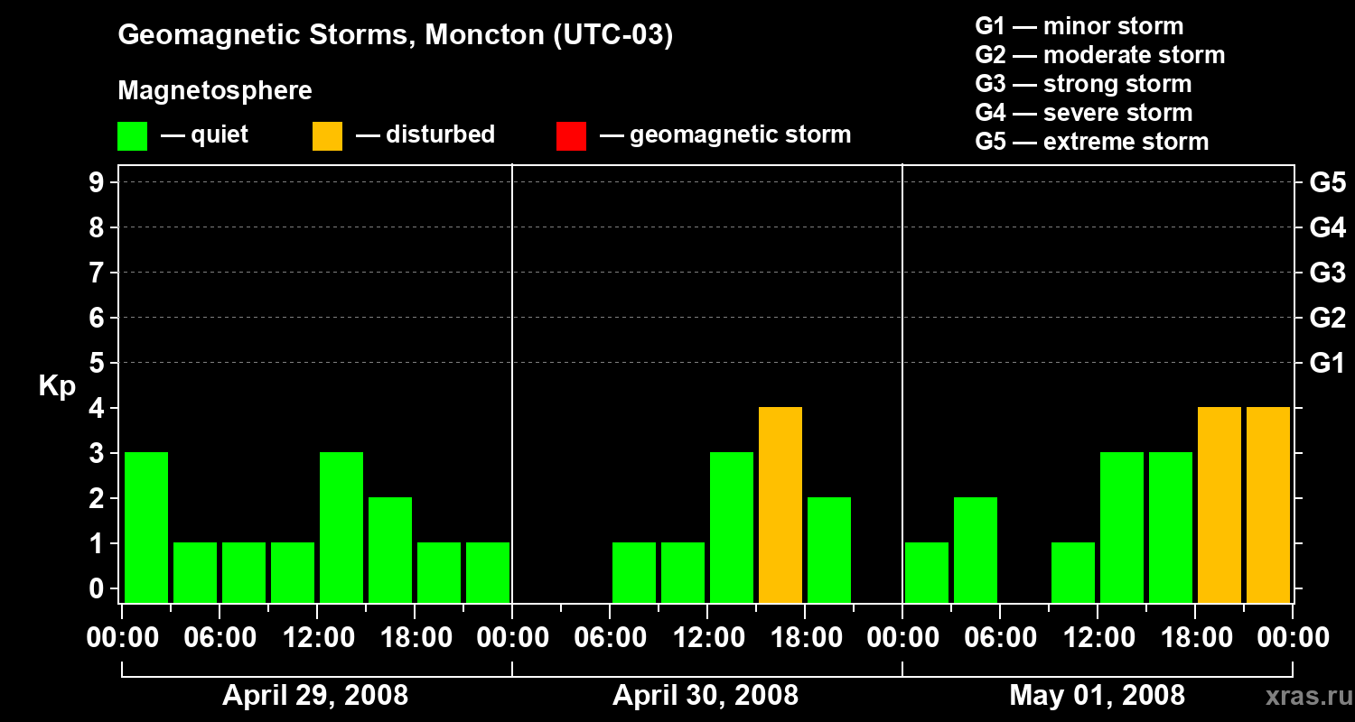 Changes in the geomagnetic index Kp from April 29 to May 1, 2008 for mid latitudes