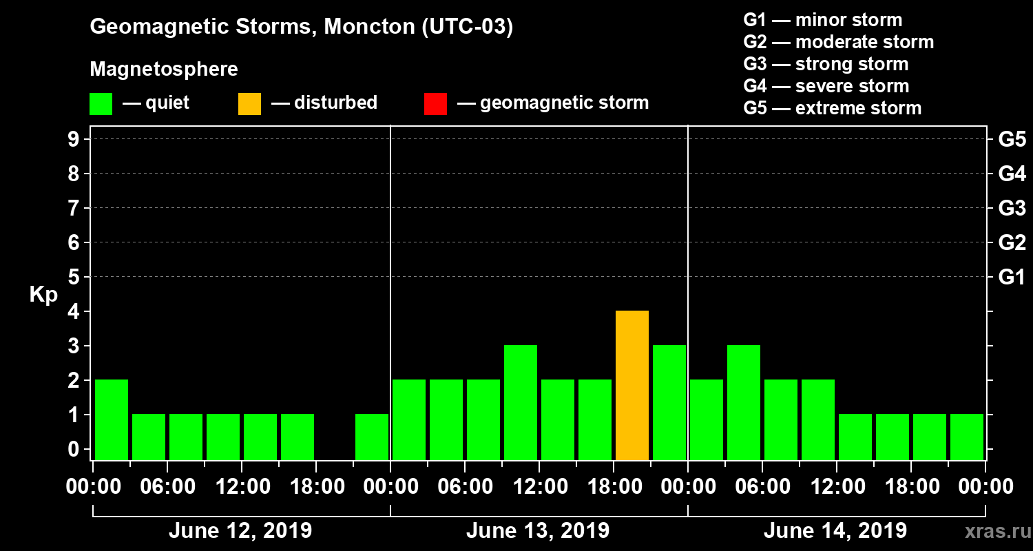 Geomagnetic storms in Moncton on Jun 14, 2019
