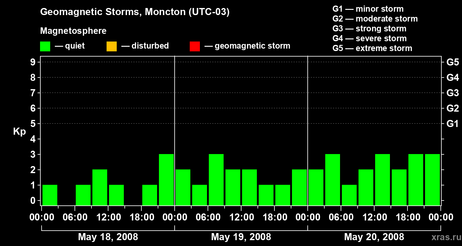 Changes in the geomagnetic index Kp from May 18 to 20, 2008 for mid latitudes
