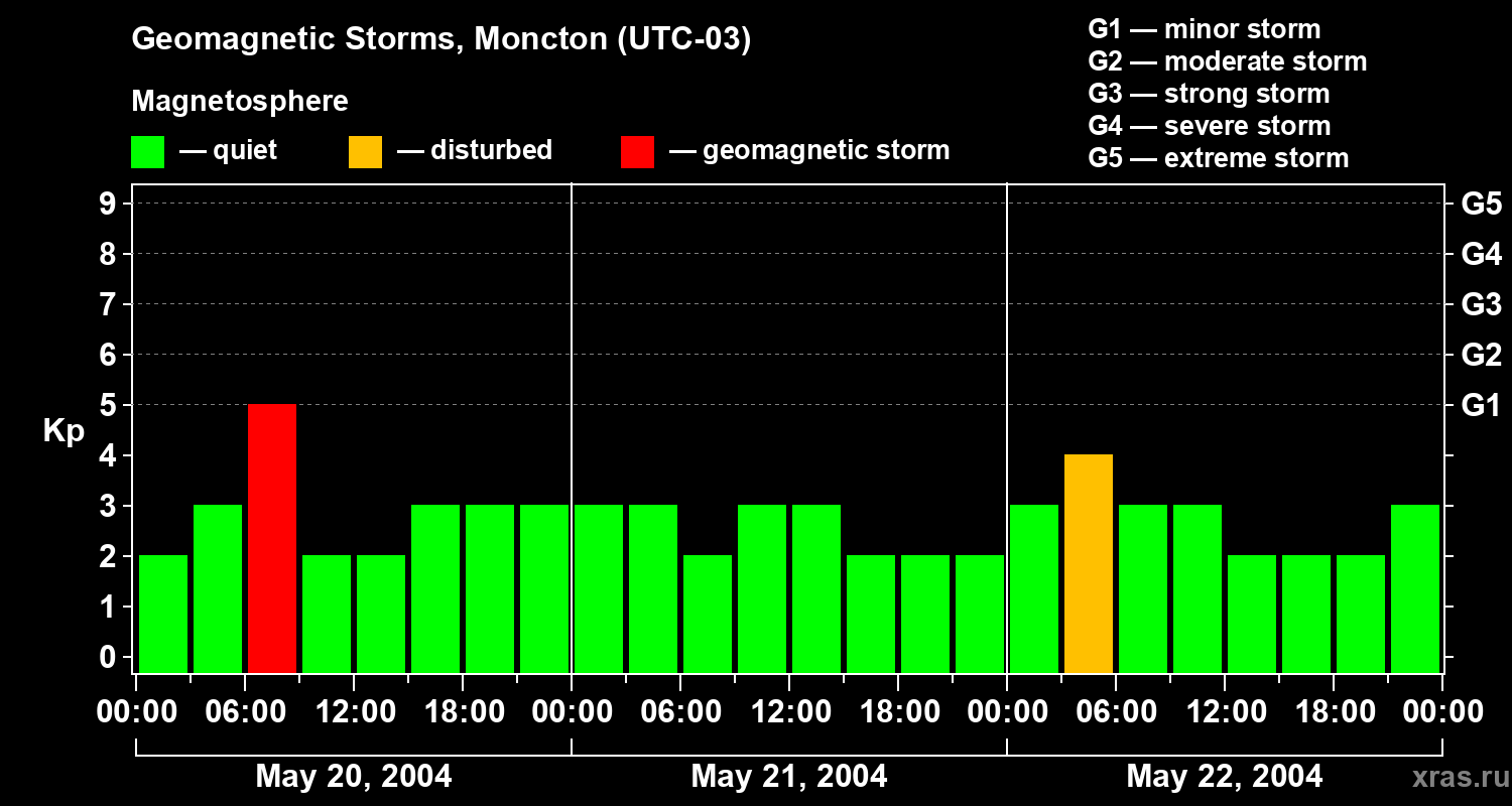 Changes in the geomagnetic index Kp from May 20 to 22, 2004 for mid latitudes