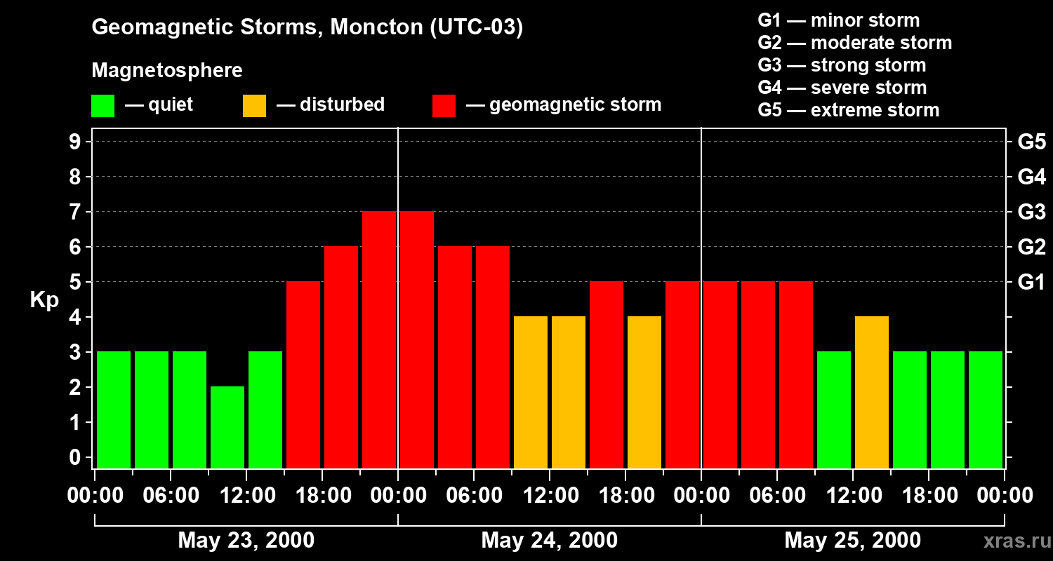 Changes in the geomagnetic index Kp from May 23 to 25, 2000 for mid latitudes