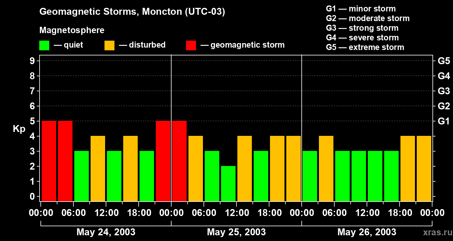 Changes in the geomagnetic index Kp from May 24 to 26, 2003 for mid latitudes