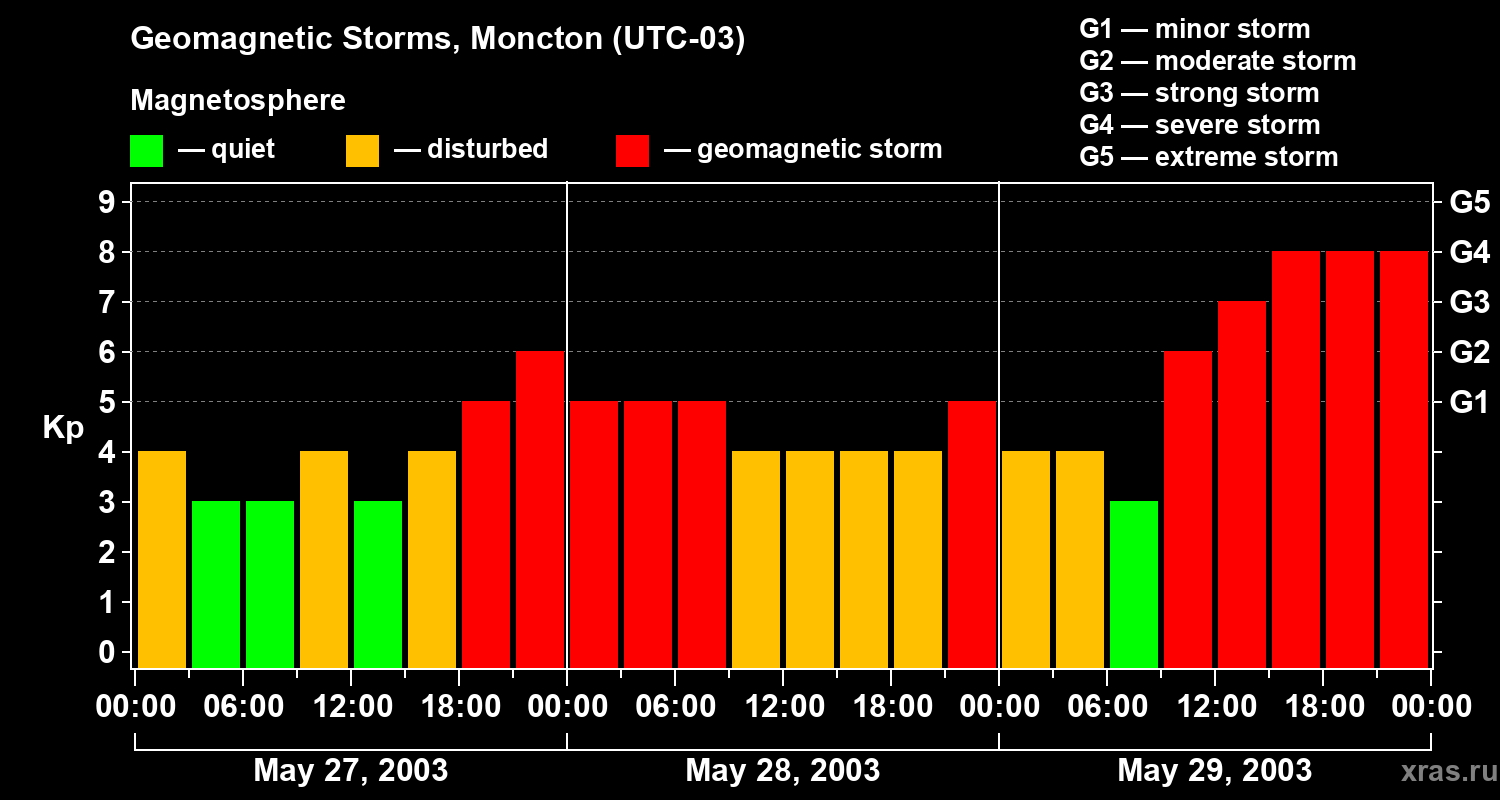 Changes in the geomagnetic index Kp from May 27 to 29, 2003 for mid latitudes