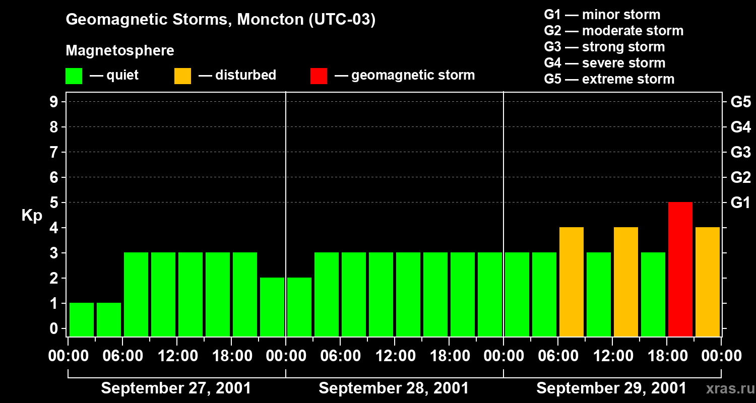 Geomagnetic storms in Moncton on Sep 29, 2001