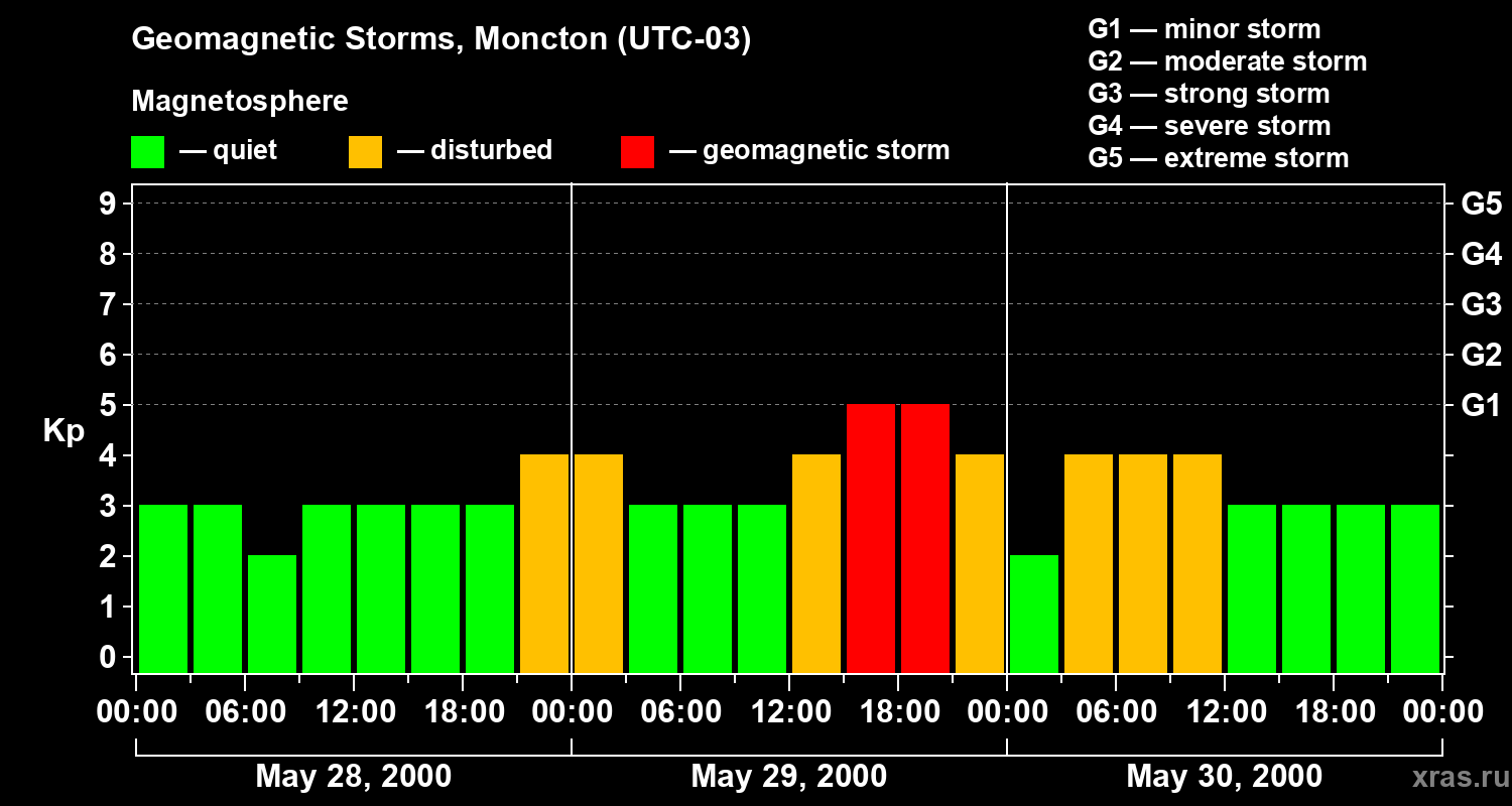 Changes in the geomagnetic index Kp from May 28 to 30, 2000 for mid latitudes