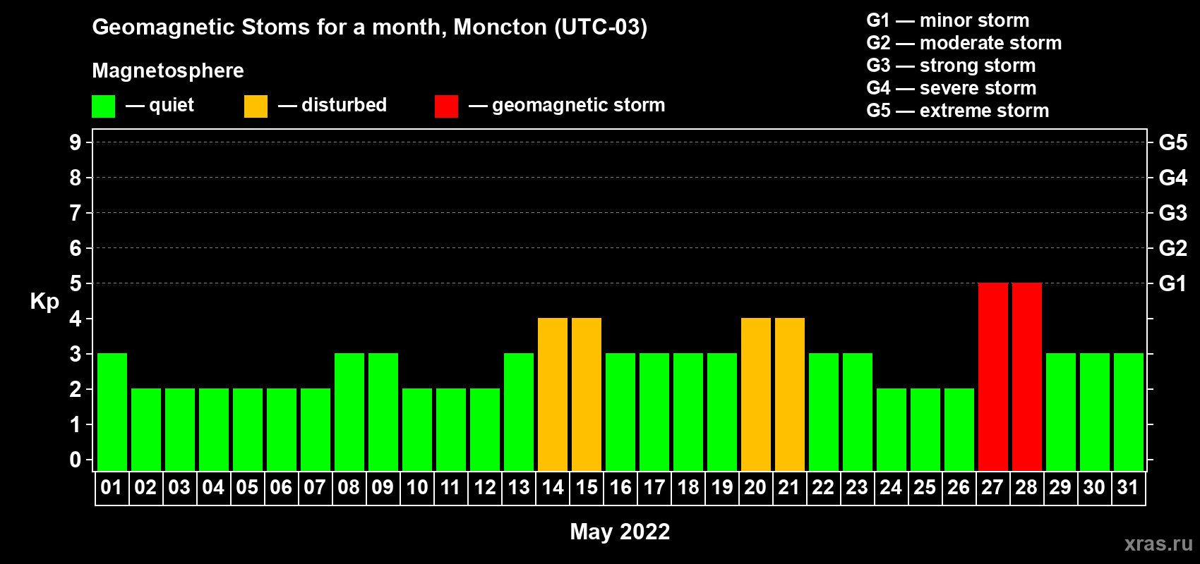 Geomagnetic storms in Moncton in May 2022
