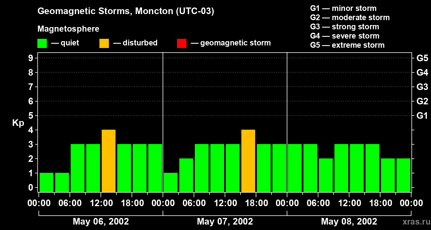 Changes in the geomagnetic index Kp from May 6 to 8, 2002 for mid latitudes