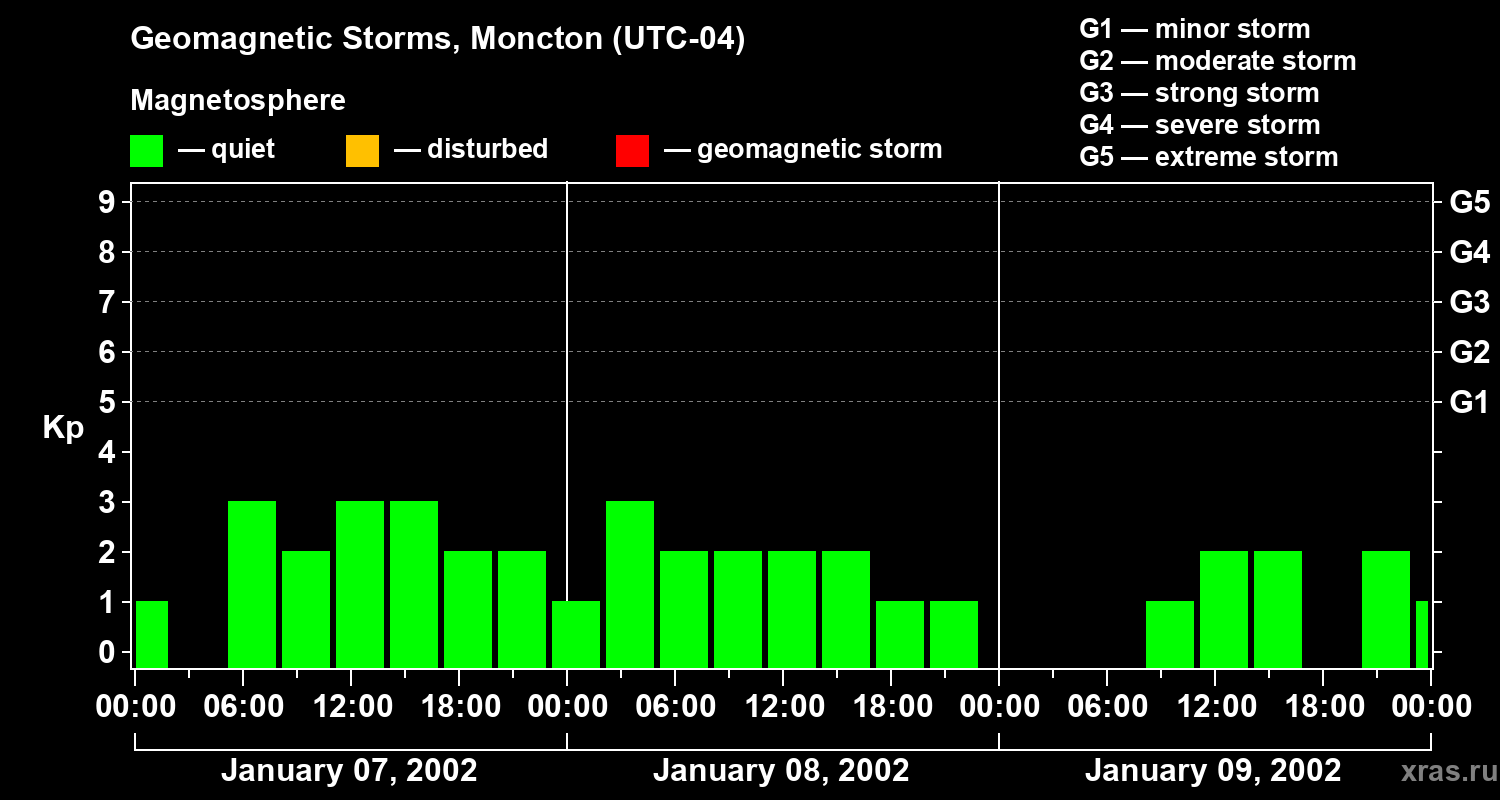Geomagnetic storms in Moncton on Jan 09, 2002