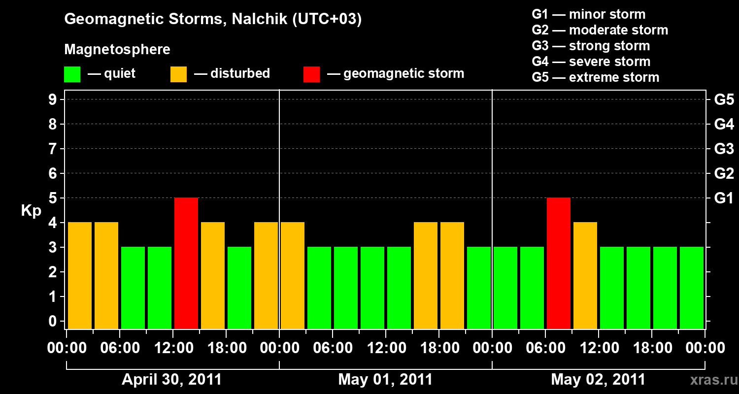 Changes in the geomagnetic index Kp from April 30 to May 2, 2011 for mid latitudes