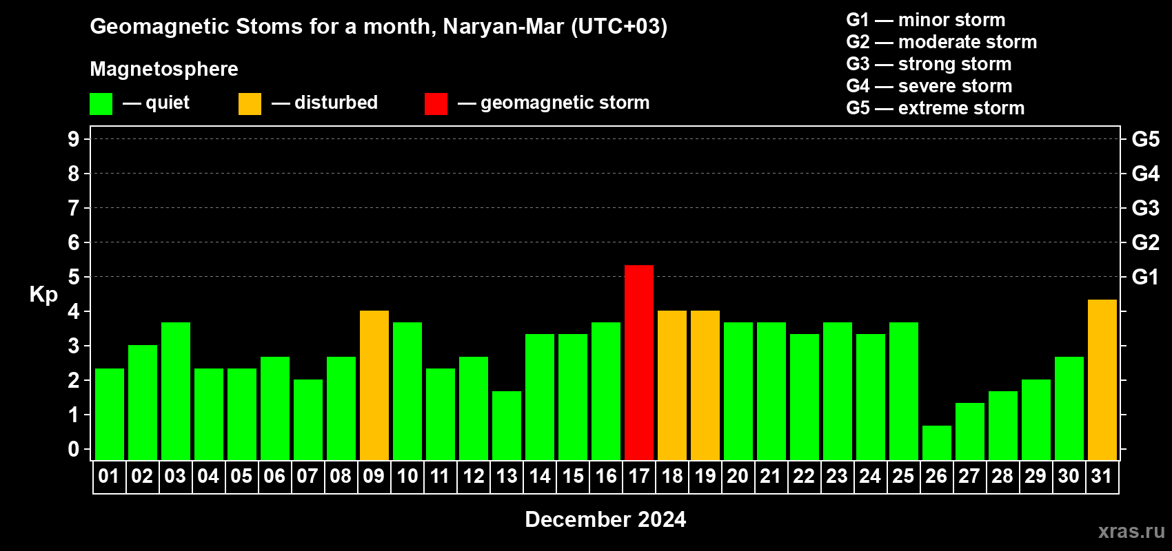Geomagnetic storms in Naryan-Mar in December 2024