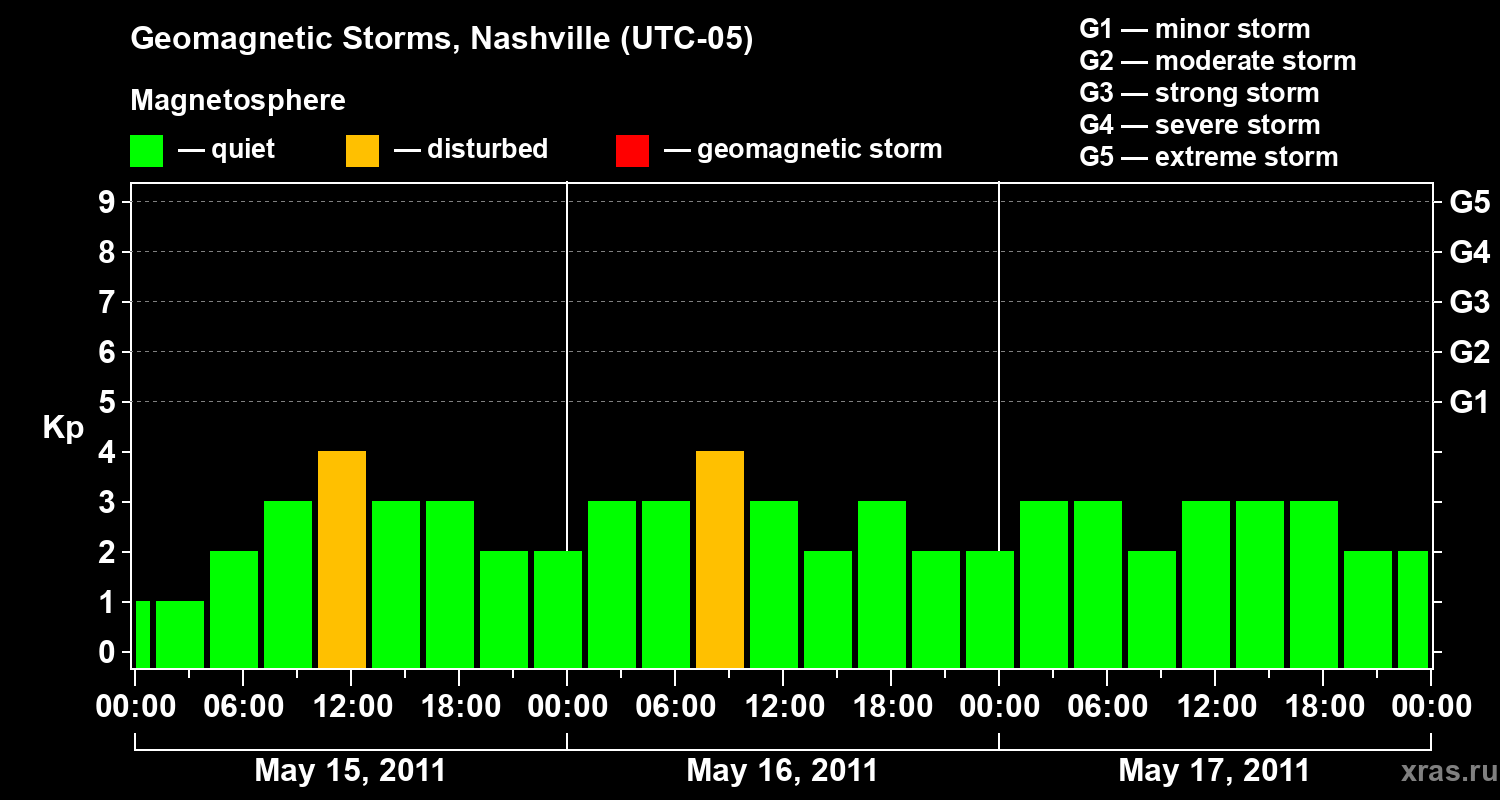 Changes in the geomagnetic index Kp from May 15 to 17, 2011 for mid latitudes