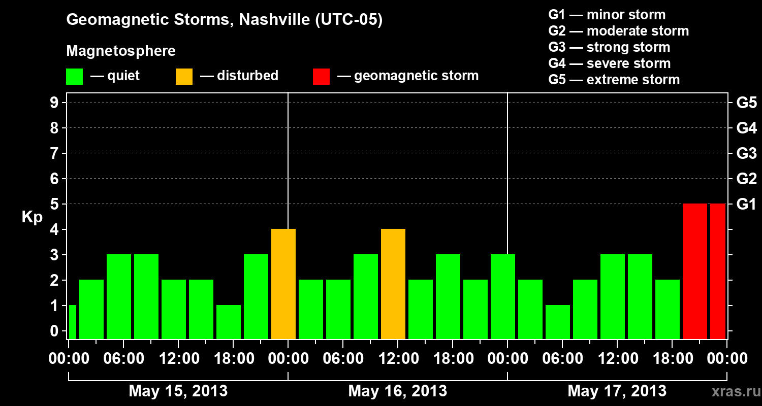 Changes in the geomagnetic index Kp from May 15 to 17, 2013 for mid latitudes