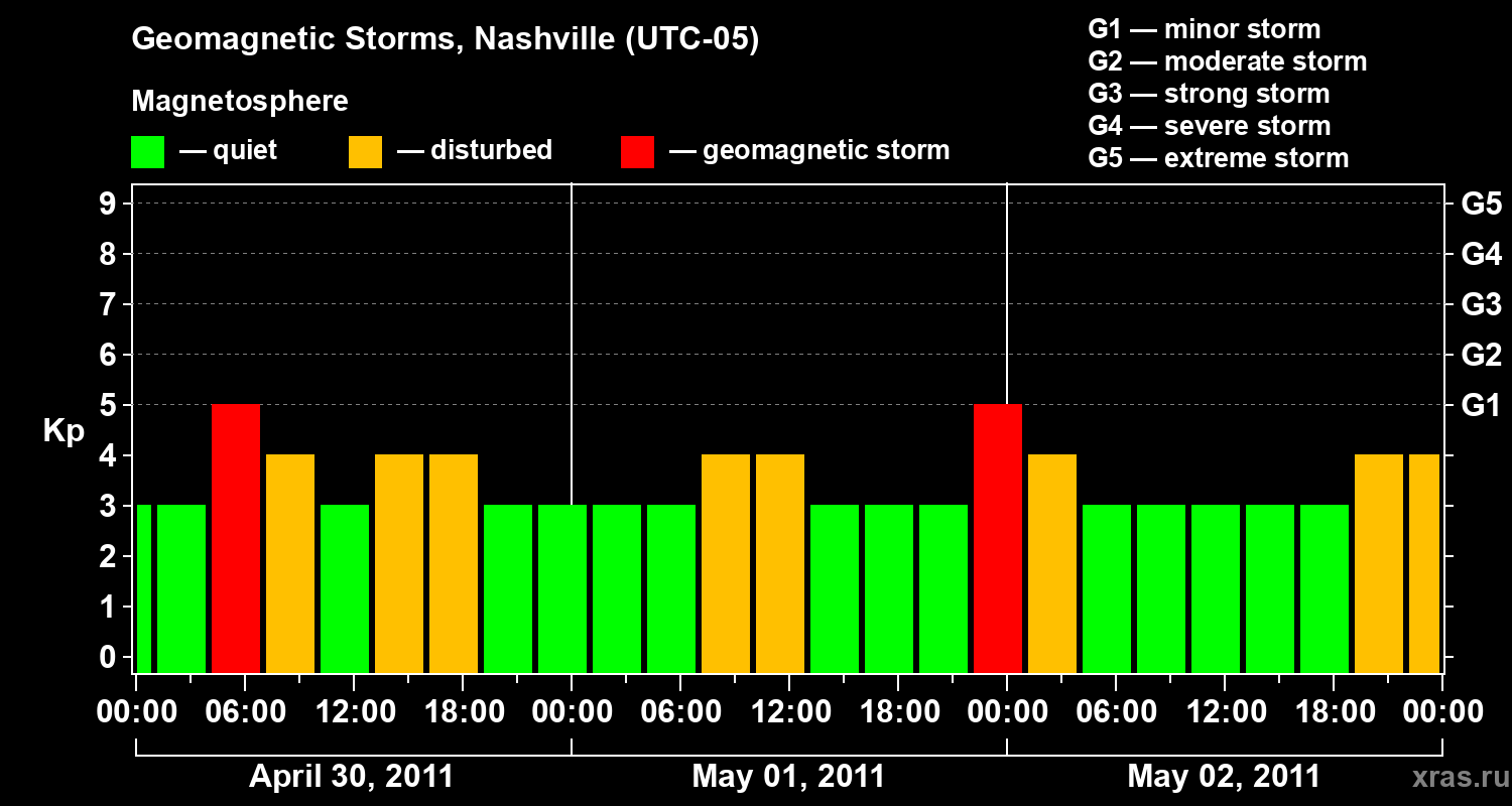 Changes in the geomagnetic index Kp from April 30 to May 2, 2011 for mid latitudes