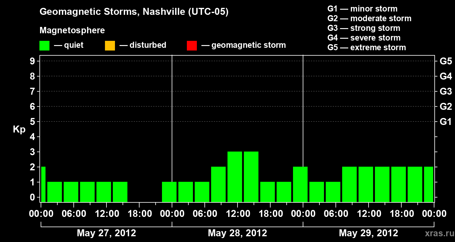 Changes in the geomagnetic index Kp from May 27 to 29, 2012 for mid latitudes
