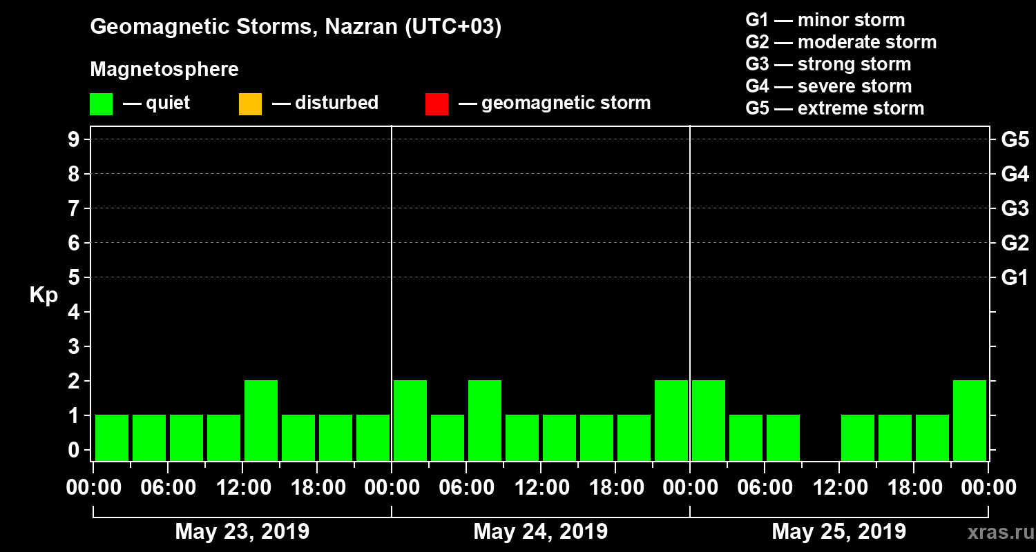 Changes in the geomagnetic index Kp from May 23 to 25, 2019 for mid latitudes