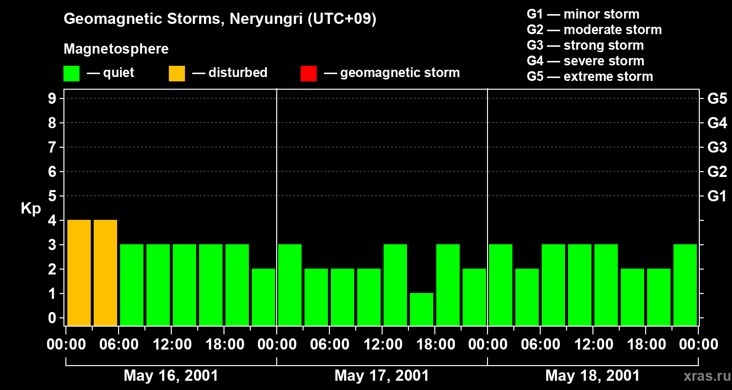 Changes in the geomagnetic index Kp from May 16 to 18, 2001 for mid latitudes