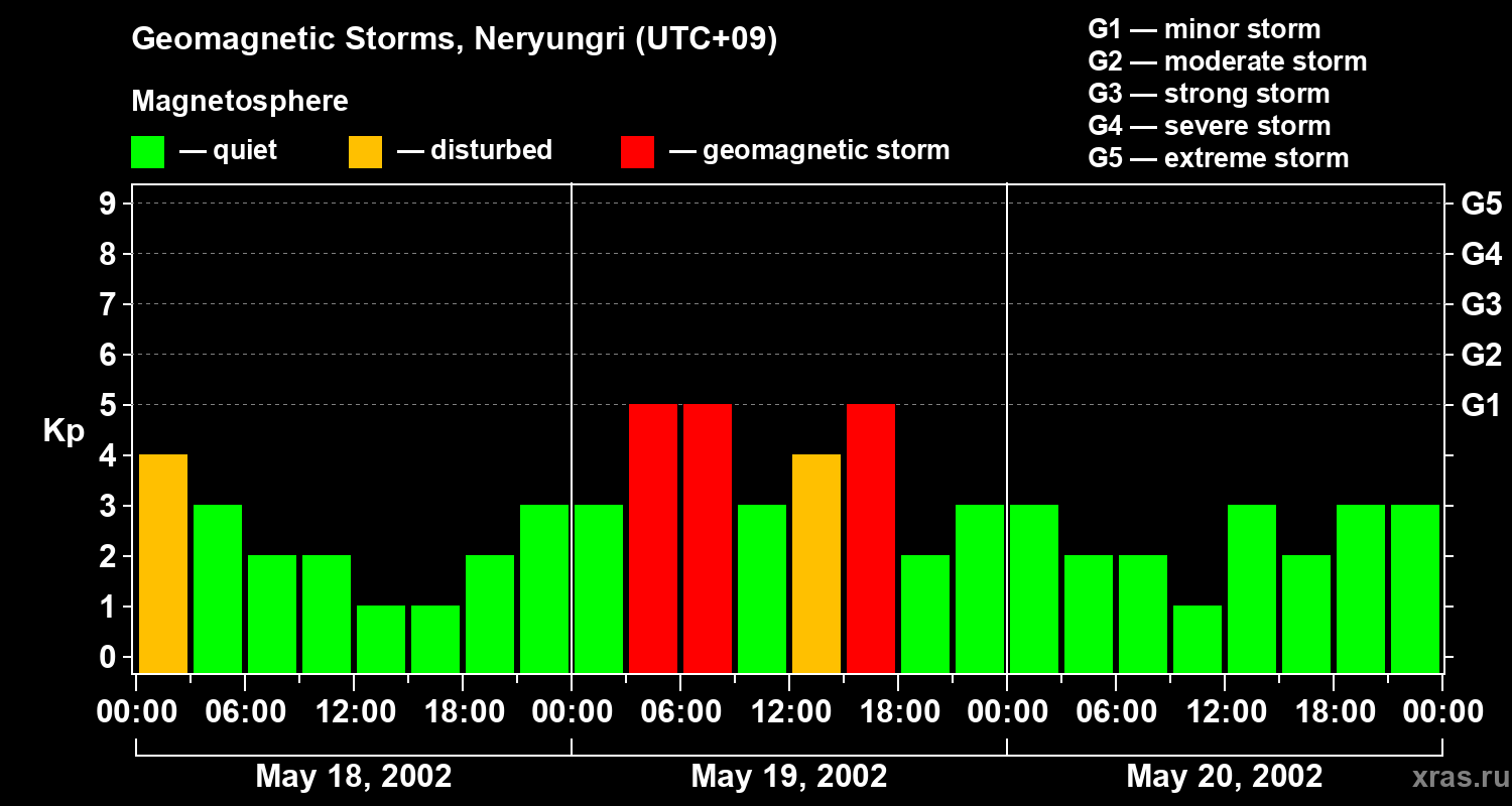 Changes in the geomagnetic index Kp from May 18 to 20, 2002 for mid latitudes