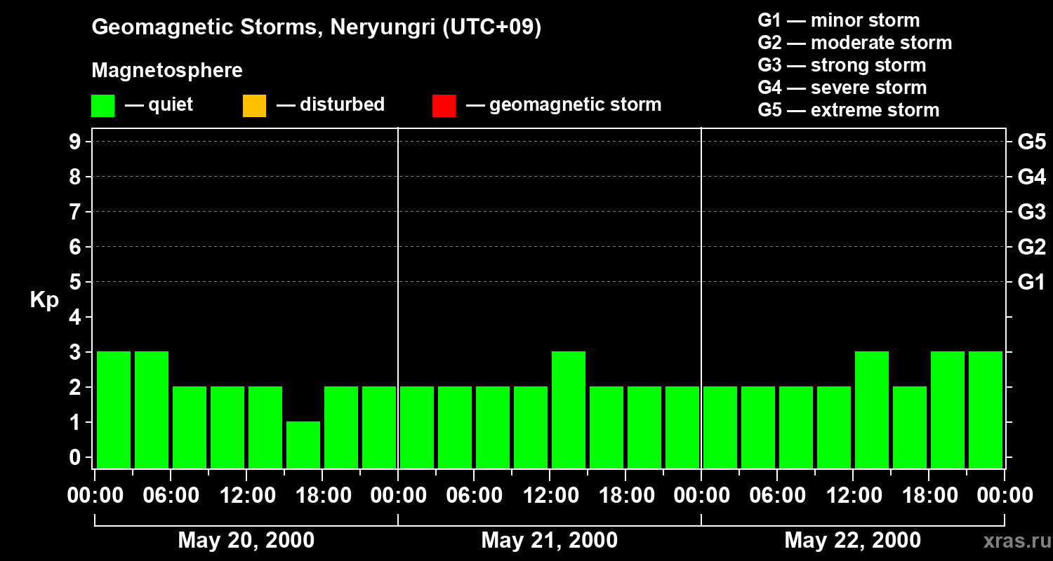 Changes in the geomagnetic index Kp from May 20 to 22, 2000 for mid latitudes