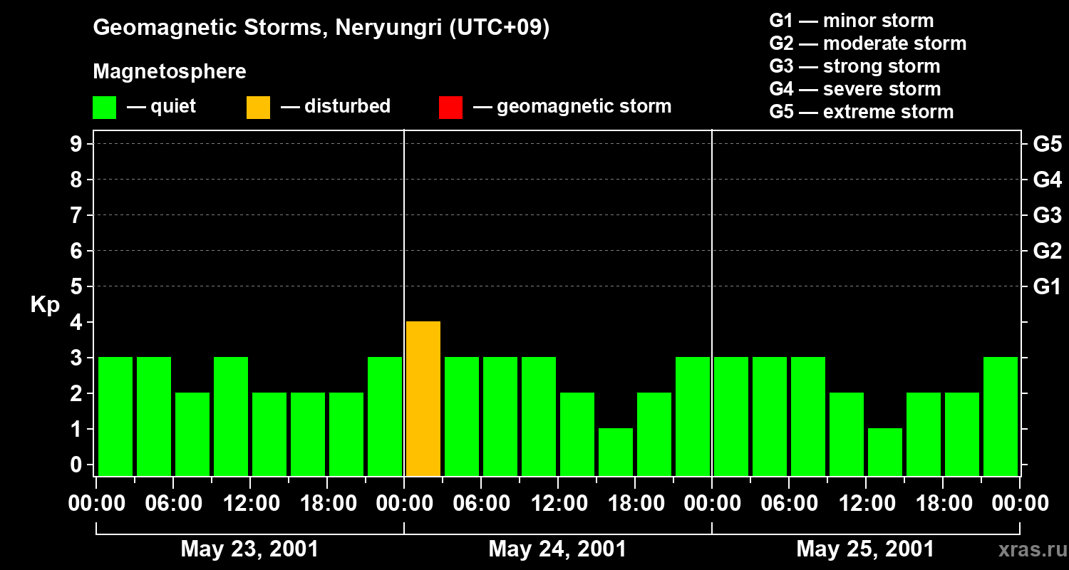 Changes in the geomagnetic index Kp from May 23 to 25, 2001 for mid latitudes