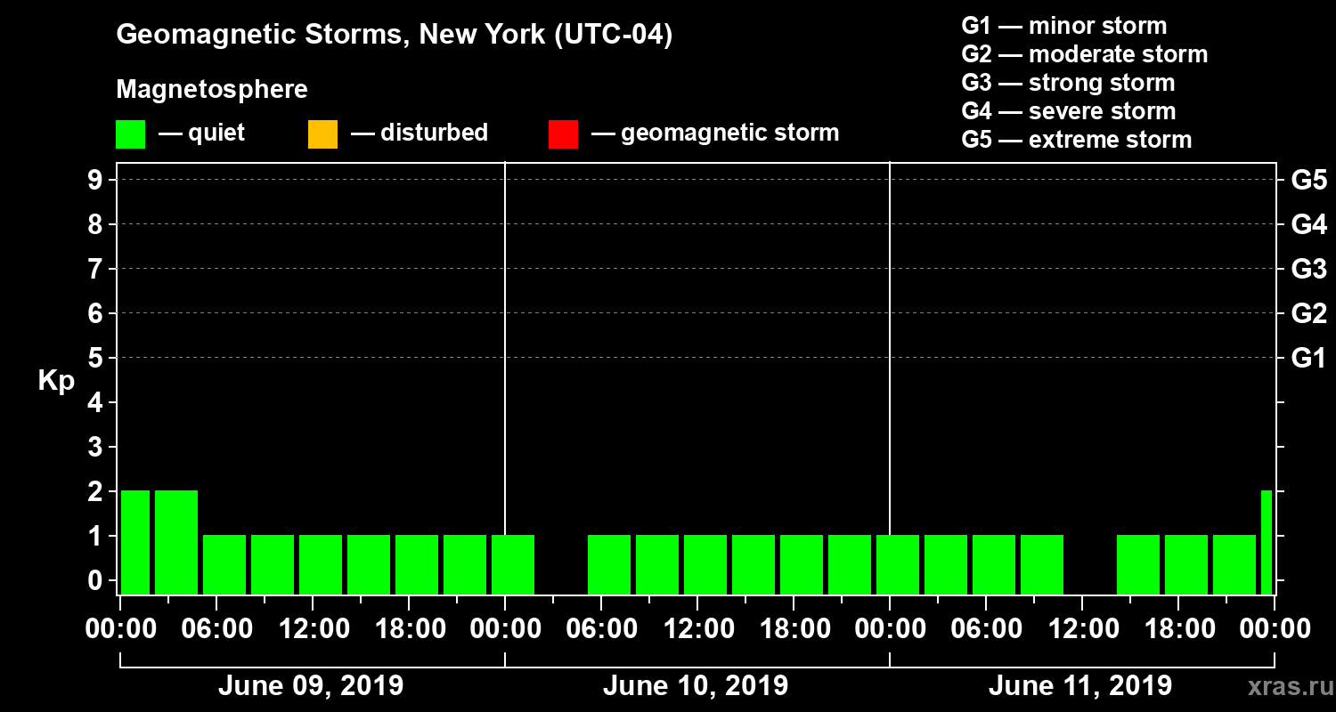 Changes in the geomagnetic index Kp from June 9 to 11, 2019 for mid latitudes