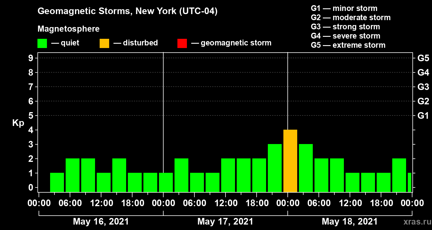 Changes in the geomagnetic index Kp from May 16 to 18, 2021 for mid latitudes