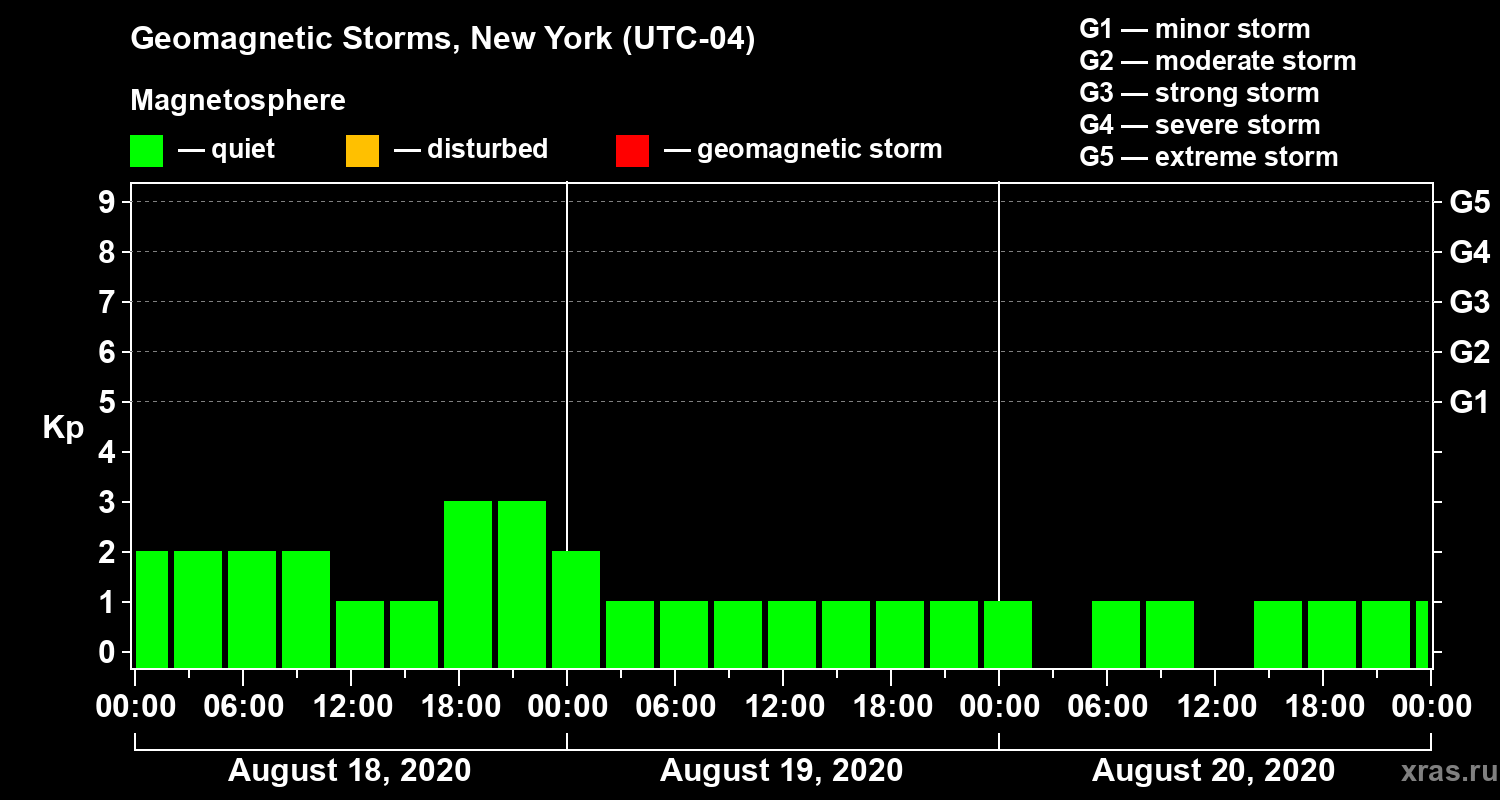 Changes in the geomagnetic index Kp from August 18 to 20, 2020 for mid latitudes