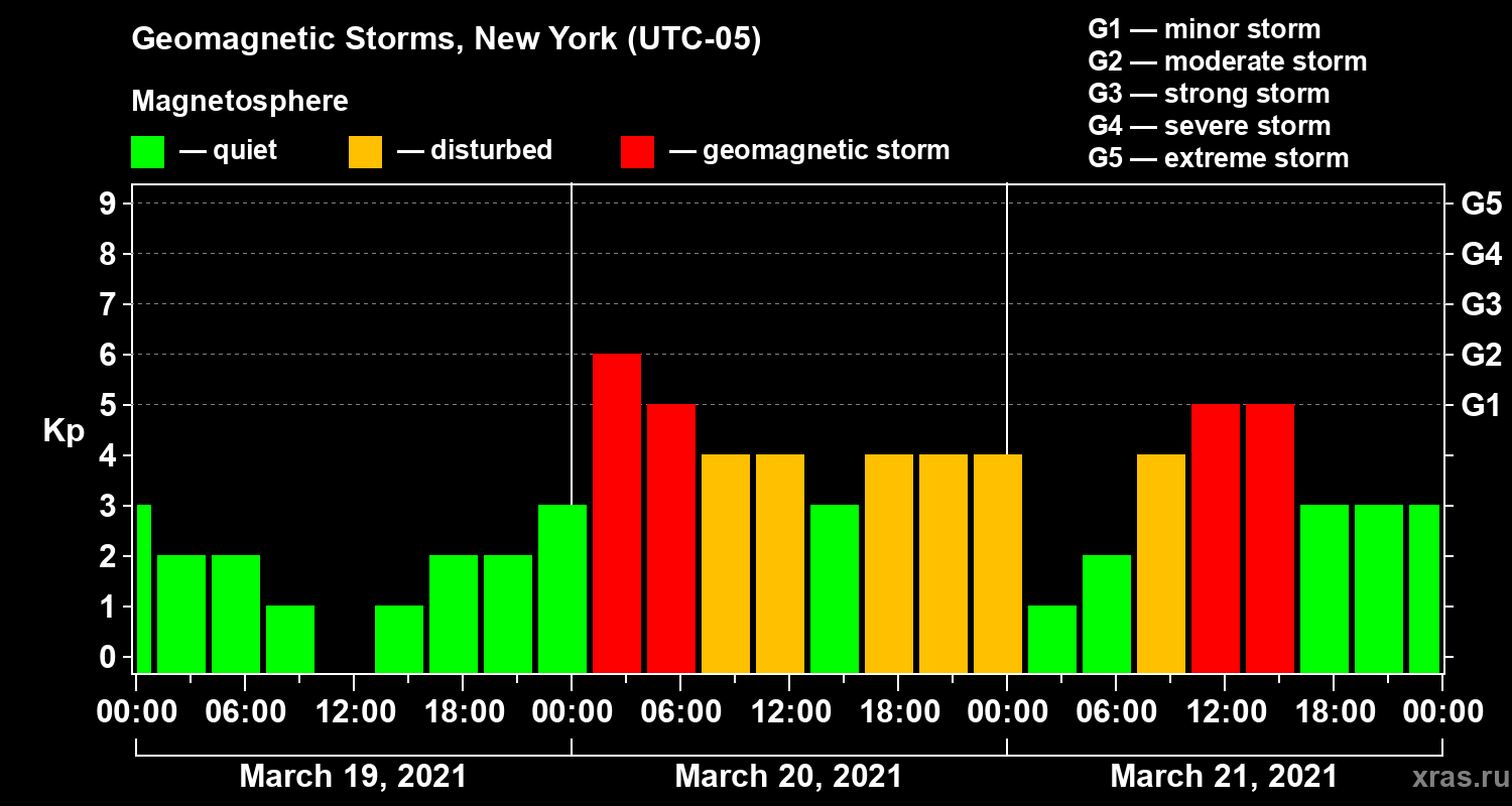Changes in the geomagnetic index Kp from March 19 to 21, 2021 for mid latitudes