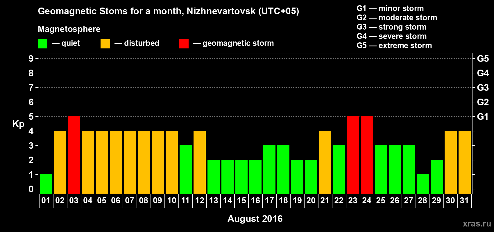 Geomagnetic storms in Nizhnevartovsk in August 2016