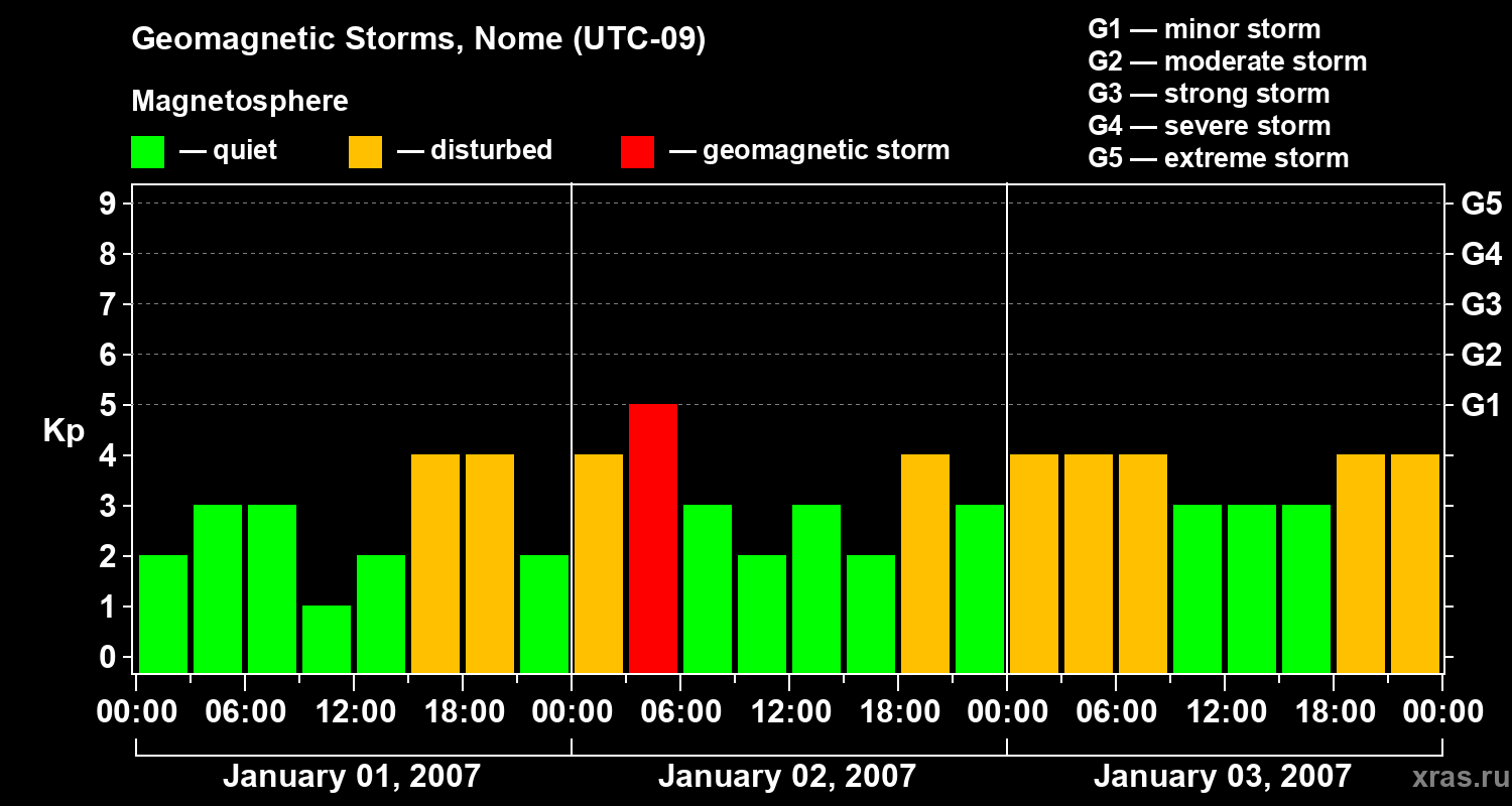 Changes in the geomagnetic index Kp from January 1 to 3, 2007 for mid latitudes